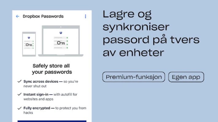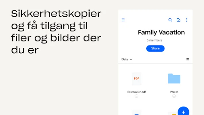 Dropbox er anerkjent som en sikker nettskytjeneste som millioner av brukere, inkludert mange Fortune 500-selskaper, stoler på for å beskytte sine mest sensitive data. Vi er dedikert til å ivareta ditt personvern og din sikkerhet, uansett hva du foretar deg eller hvor du befinner deg. Oppdag alle fordelene med Dropbox Plus gjennom en gratis prøveperiode som gir deg hele 2 TB lagringsplass – nok til å romme alt ditt digitale innhold. Med Dropbox Rewind kan du tilbakestille filer, mapper eller hele kontoen opptil 30 dager bakover i tid. Abonnement administreres enkelt via din Google Play-konto og fornyes automatisk, men kan deaktiveres når som helst, minst 24 timer før neste fornyelse.