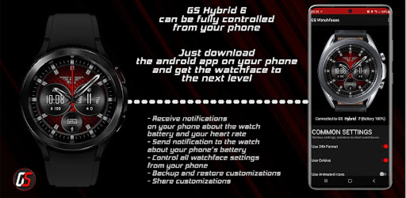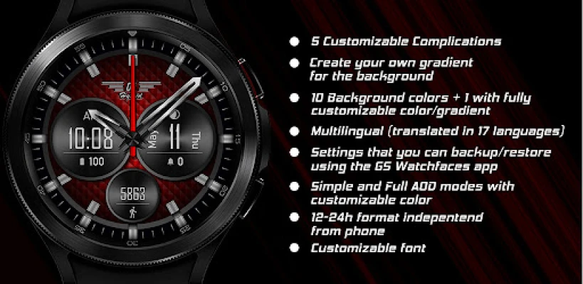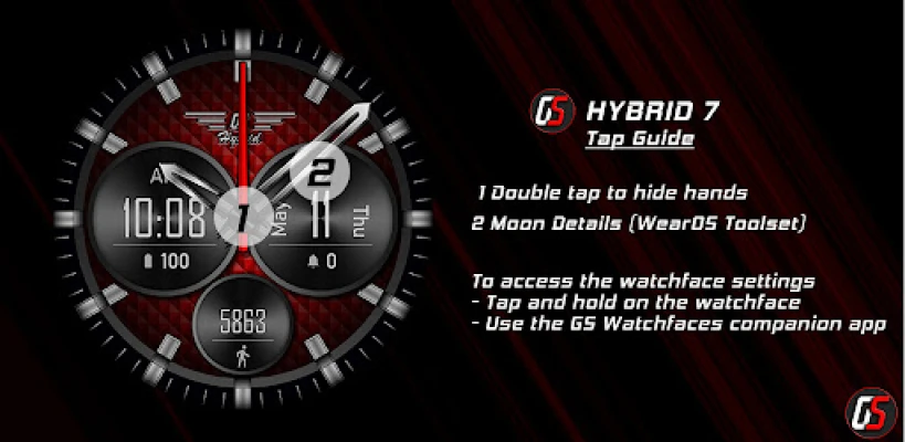GS Hybrid 6 Watch Face er en hybrid Wear OS-urskive som kombinerer analog og digital tid. Med støtte for 17 språk tilbyr den 5 redigerbare komplikasjoner, månefase og et bredt utvalg av tilpasninger. Tilpass med unike bakgrunner, sirkelfarger og skrifttyper for et personlig utseende.