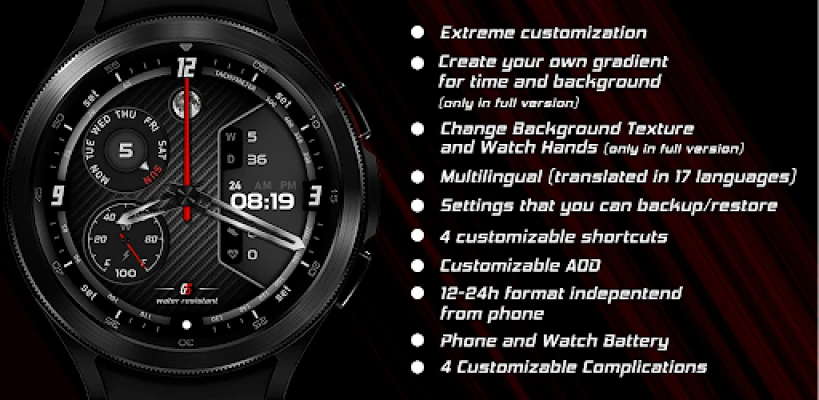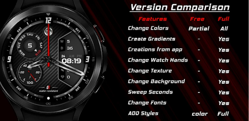 Vær oppmerksom på at den gratis versjonen av denne urskiven tilbyr en flott introduksjon til dens muligheter, men med et begrenset utvalg av tilpasningsalternativer. For å låse opp det fulle potensialet og dykke dypere inn i personlig tilpasning, anbefaler vi å utforske fullversjonen. For en detaljert sammenligning av funksjonene tilgjengelig i den gratis kontra fullversjonen, kan du referere til de medfølgende bildene. Oppdag en urskive som ikke bare viser tiden, men som også tilpasser seg deg.