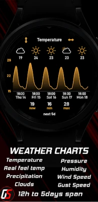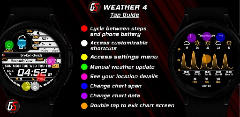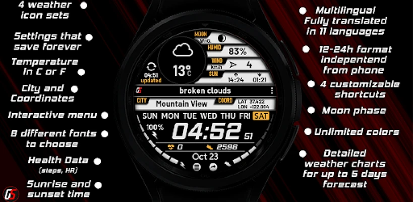 GS Weather 4 er en avansert værskive for Wear OS smartklokker, full av unike funksjoner og ekstrem tilpasning. Den er fullt oversatt til 11 språk og gir deg detaljert værinformasjon rett på håndleddet ditt.
