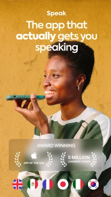 Speak forbedrer dine taleferdigheter med AI-drevet læring. Få flyt i spansk, engelsk, fransk, italiensk, japansk eller koreansk gjennom reelle samtaler og øyeblikkelig tilbakemelding. Lær raskt med Speak.